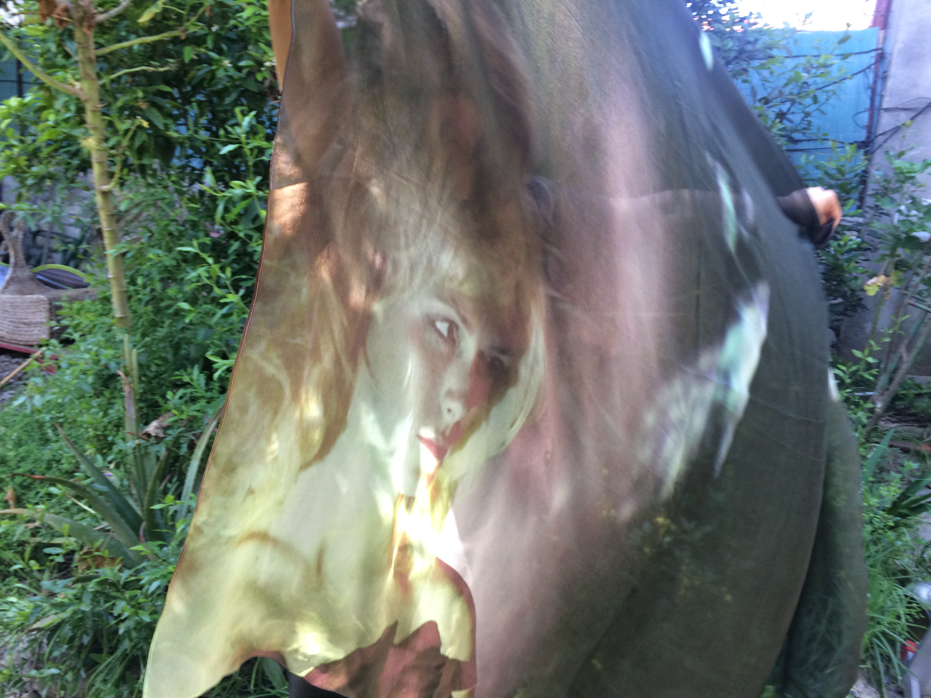 Foulard en soie exclusif Nönude Louverture. Visage de Maya Arbel, regard photographique Bernard Bousquet, création Sarah Cassenti.