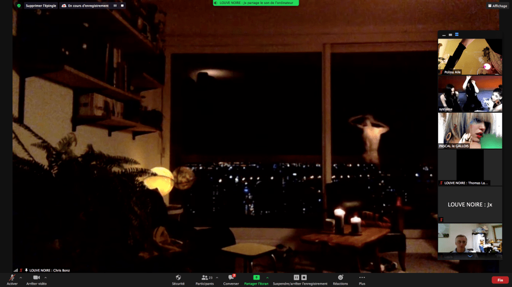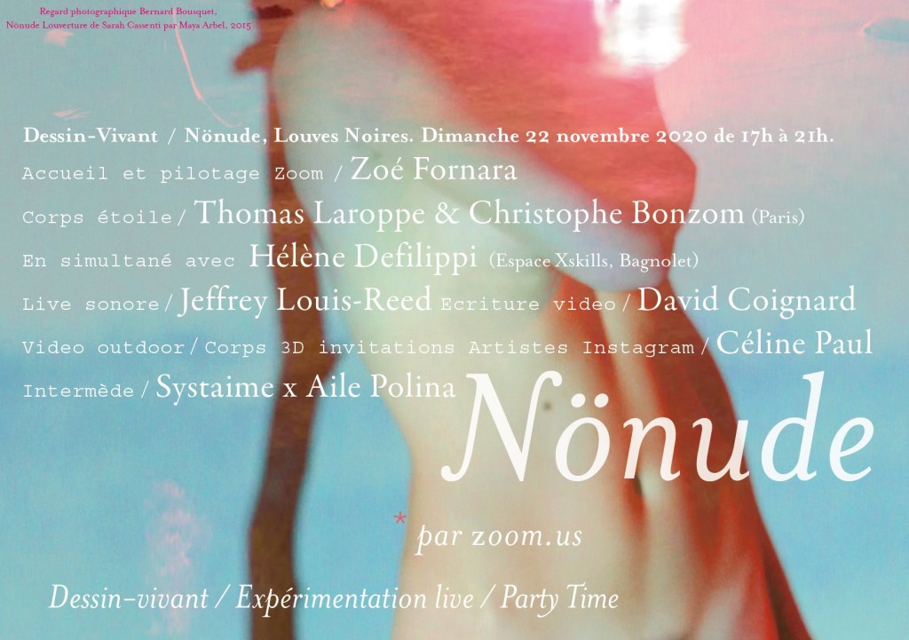 • Nönude Louves Noires de 17h à 21h • Dimanche 22 novembre 2020 • En ligne par ZOOm.us • Atelier expérimental de Dessin modèle-vivant longue durée. Ecriture Video et Sonore Live. Joy • Corps-étoile / poses en mouvement : Thomas Laroppe et Christophe Bonzom • Hélène Defilippi ( Espace Xskills ). Live sonore : Jeffrey Louis-Reed (uk). Ecriture video : David Coignard. Video outdoor : Céline Paul. Accueil et pilotage Zoom : Zoé Fornara. Intermèdes : Systaime x Aile Polina. Dessinateurs invités : Michel Lascault, Pascal le Gallois, Cyneye. Participants : Vous ! • https://fb.me/e/25WY6WVey