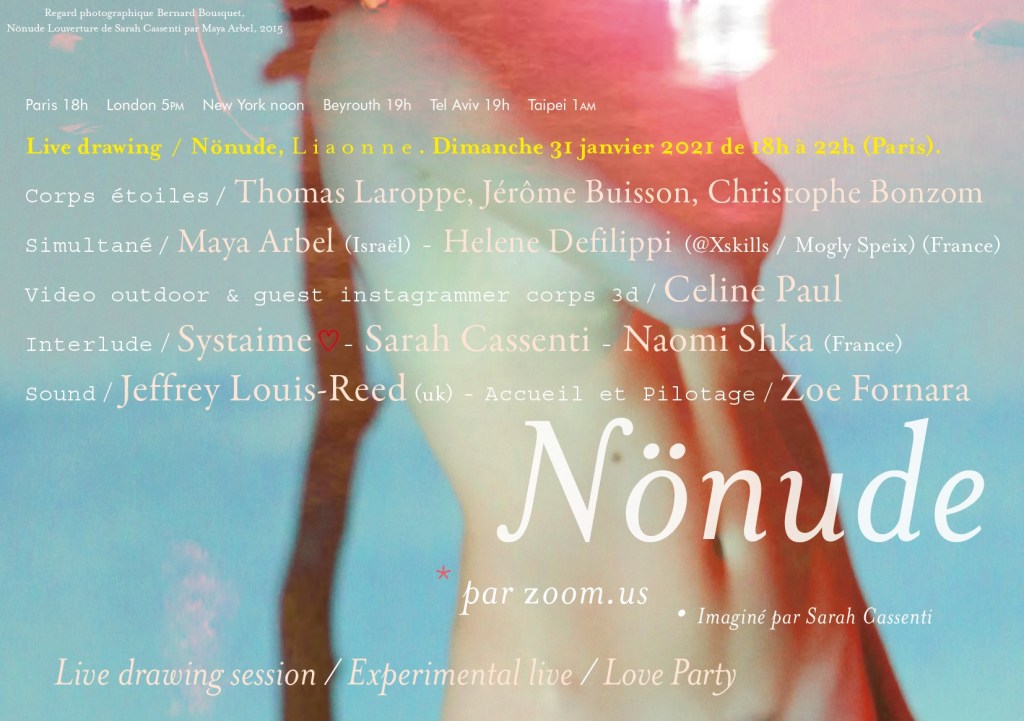 • Nönude Libre L i a o n n e • Dimanche 31 janvier 2021 / Zoom.us • 4h de gestes et de dessin en continu, 5 performeurs • Nönude L i a o n n e, imaginé par Sarah Cassenti • Workshop de Dessin modèle-vivant en simultané • Ecriture Vidéo & Live Sonore • L o v e Party • En ligne par ZOOm.us • Corps étoiles : Thomas Laroppe Christophe Bonzon et Jérôme Buisson (Paris) & Maya Arbel (Tel Aviv) • Intermèdes / Systaime (Limoges) x Sarah Cassenti (La Ciotat) • Live sonore / Jeffrey Louis-Reed (Hastings) • Video outdoor : Celine Paul (Nîmes) • Accueil et pilotage sur Zoom / Zoé Fornara (Paris) • https://fb.me/e/3jQZ3Gvo0