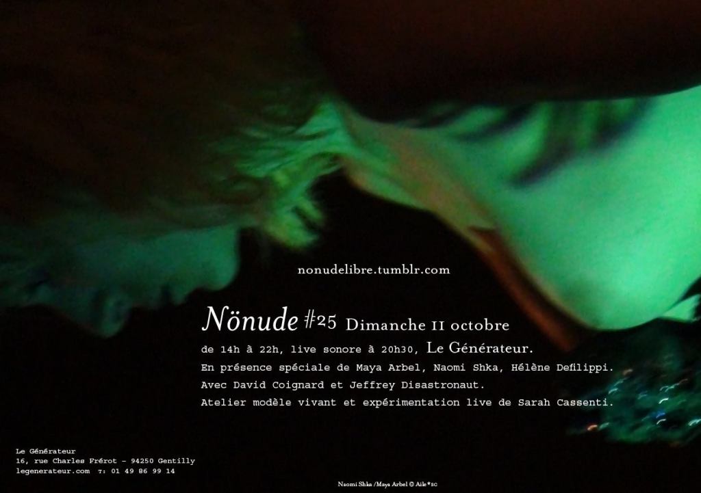 • Le Nönude est une expérience VIVE de dessin-vivant, mené depuis 2012 par Sarah Cassenti – Aile Polina et par ses complices. Cette fois-ci, il aura lieu en ligne, Corps-vivants, Corps-mouvants en simultané. Deux scènes se déroulent en même temps sur la durée du Mix sonore et de l’écriture video directe. Les participants dessinent, fêtent, dansent et ouvrent ce temps avec nous. L’exaltation monte •