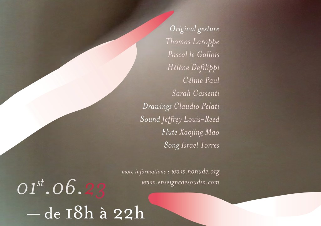 Le Nönude workshop de dessin-vivant / corps étoiles est imaginé et mené par Sarah Cassenti et ses complices Céline Paul, Hélène Defilippi, Thomas Laroppe, Jeffrey Louis-Reed, Maya Arbel, Pascal le Gallois, Xavier Numa Borloz, Claudio Pelati, JaneB, Alain Wagner, MS, Jean-St Clair. Le Nönude existe depuis 2012, il a cours dans le Sud de la France, en région parisienne chez nos hôtes singuliers et par Zoom World Wide Love lors de la Pandémie.