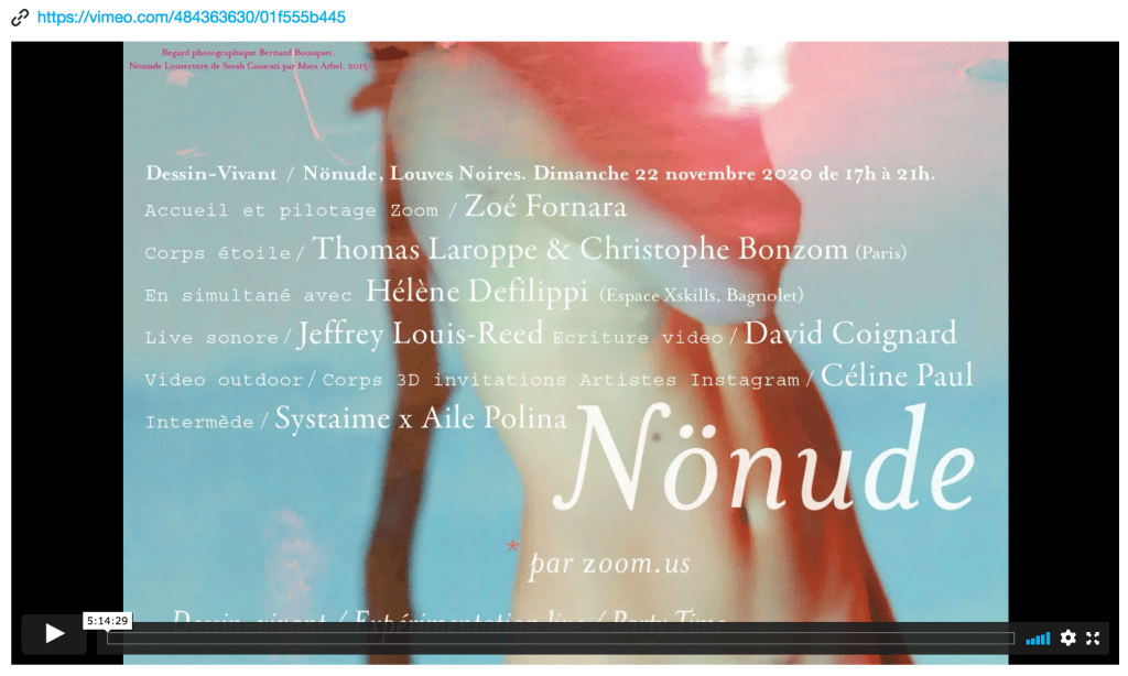 Nönude Louves Noires de 17h à 21h • Dimanche 22 novembre 2020 • En ligne par ZOOm.us • Atelier expérimental de Dessin modèle-vivant longue durée. Ecriture Video et Sonore Live. Joy. Le Nönude est une expérience VIVE de dessin-vivant, mené depuis 2012 par Sarah Cassenti – Aile Polina et ses complices. Cette fois-ci, il aura lieu en ligne, Corps-vivants, Corps-mouvants en simultané. Deux scènes se développent sur la durée du son et de l’écriture video directe, des intermèdes scandent l’action. Peintres, dessinateurs, créateurs inventent. Les participants dessinent, fêtent, dansent et ouvrent ce temps avec nous. L’exaltation monte.